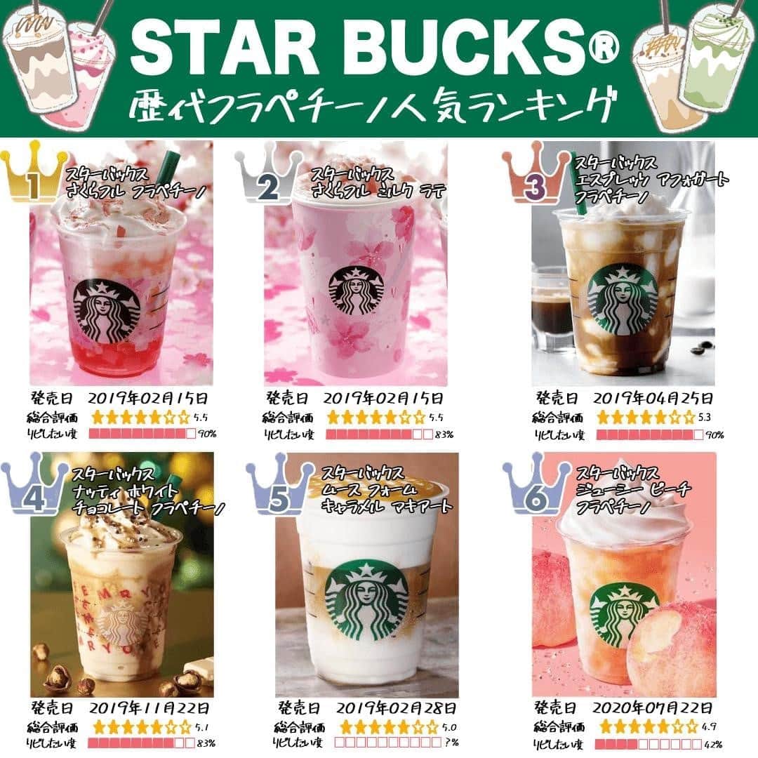 もぐナビさんのインスタグラム写真 もぐナビinstagram スタバ歴代フラペチーノ人気ランキング 1位 さくらフル フラペチーノ 2位 さくらフル ミルク ラテ 3位 エスプレッソ アフォガート フラペチーノ 4位 ナッティ ホワイト チョコレート
